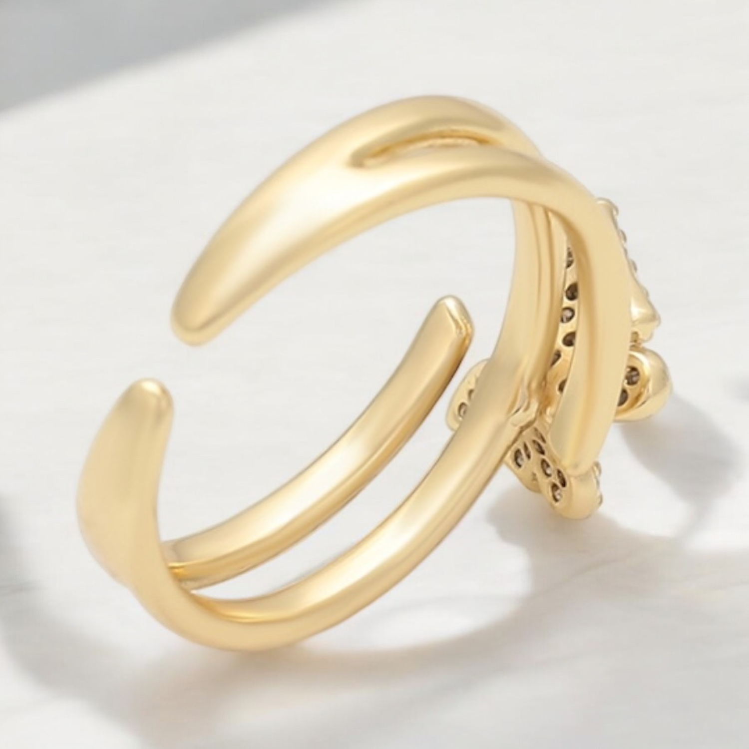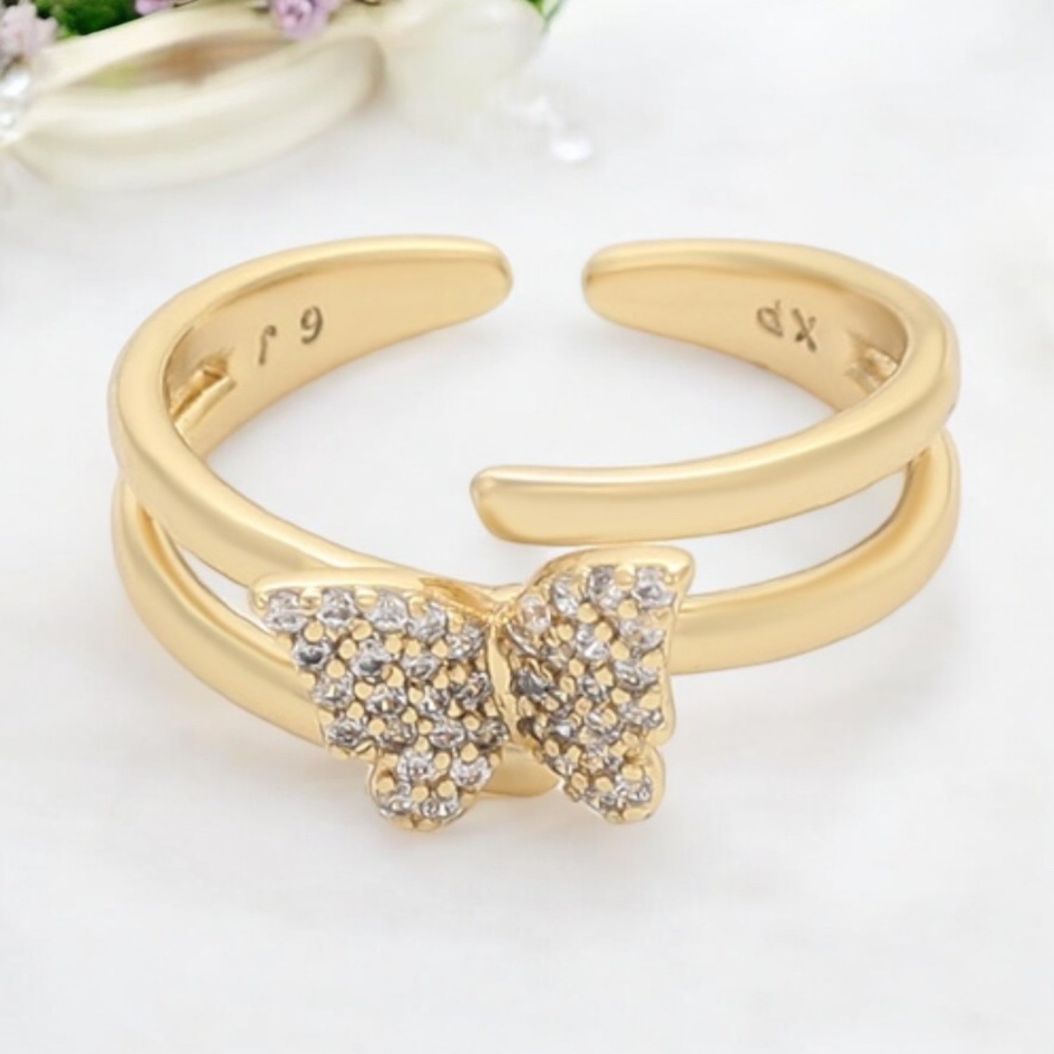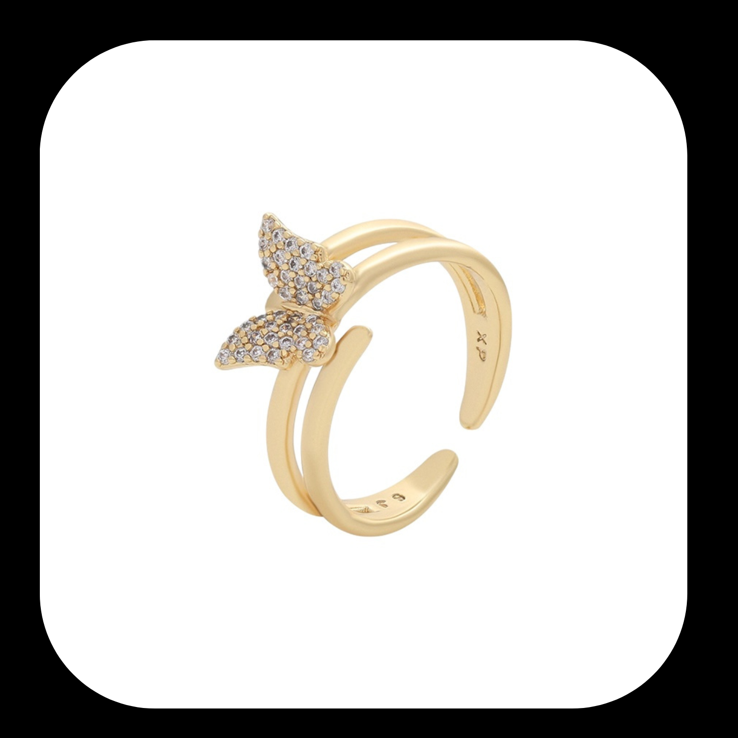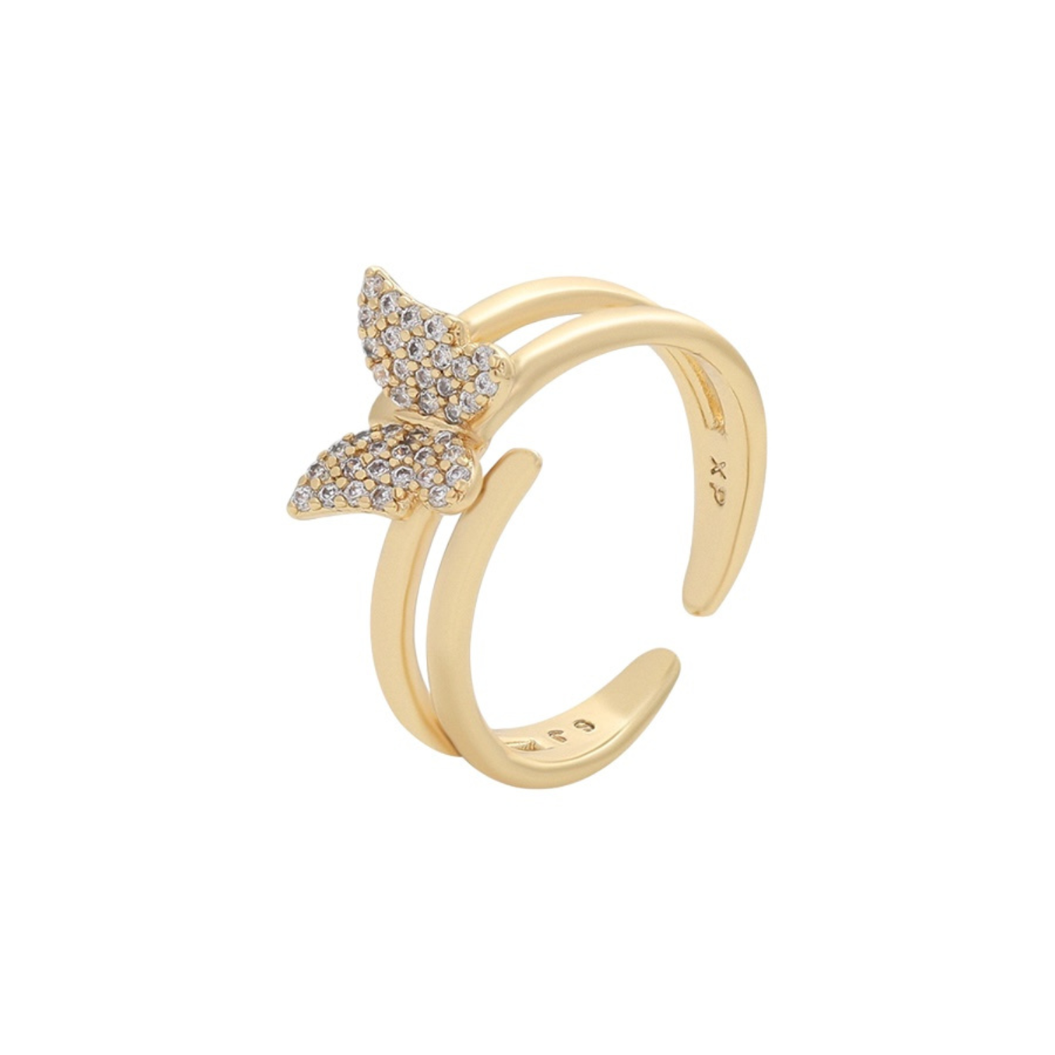 Embrace the whimsy of nature with the 'Astral Butterfly Ring,' featuring a charming butterfly adorned with sparkling crystals, set against a polished gold band. This open ring is a symbol of transformation and beauty, perfect for everyday elegance or special occasions.